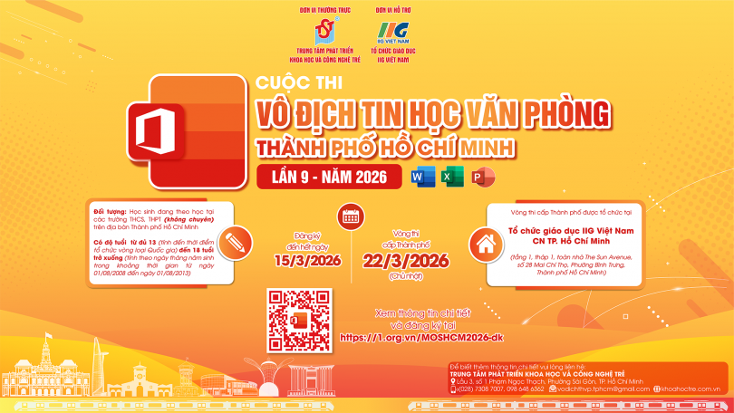Căn cứ kế hoạch số 435-KH/TWĐTN-KHCN, ngày 20 tháng 01 năm 2026 của Ban Chấp hành Trung ương Đoàn TNCS Hồ Chí Minh về kế hoạch tổ chức Cuộc thi Vô địch Tin học văn phòng thế giới năm 2026; Nhằm nâng cao nhận thức và tạo điều kiện cho học sinh thành phố tiếp cận các kỹ năng tin học văn phòng theo tiêu chuẩn quốc tế, thúc đẩy hoạt động giao lưu, hội nhập quốc tế cho thanh thiếu niên, góp phần phát triển phong trào học tập, ứng dụng công nghệ thông tin trong thanh thiếu niên và phát triển nguồn nhân lực trẻ chất lượng cao tham gia thực hiện chuyển đổi số quốc gia, đồng thời tuyển chọn đội tuyển tham gia Cuộc thi Vô địch Tin học văn phòng cấp quốc gia. Trung tâm Phát triển Khoa học và Công nghệ Trẻ ban hành Thông báo về tổ chức Cuộc thi Vô địch Tin học Văn phòng Thành phố Hồ Chí Minh lần 9, năm 2026 với các nội dung, cụ thể như sau:
