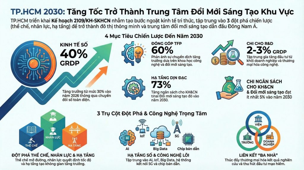 Với việc ban hành Kế hoạch số 2109/KH-SKHCN ngày 16/3/2026 , TP.HCM chính thức xác lập lộ trình đưa khoa học, công nghệ và đổi mới sáng tạo trở thành “động cơ vĩnh cửu” cho tăng trưởng kinh tế giai đoạn 2025–2030. Không dừng lại ở việc ứng dụng, Thành phố đang tập trung mọi nguồn lực để làm chủ công nghệ lõi, triển khai mạnh mẽ trí tuệ nhân tạo (AI) và các cơ chế thử nghiệm đột phá, khẳng định vị thế hạt nhân dẫn dắt tiến trình chuyển đổi số và phát triển bền vững của cả nước trong kỷ nguyên mới.